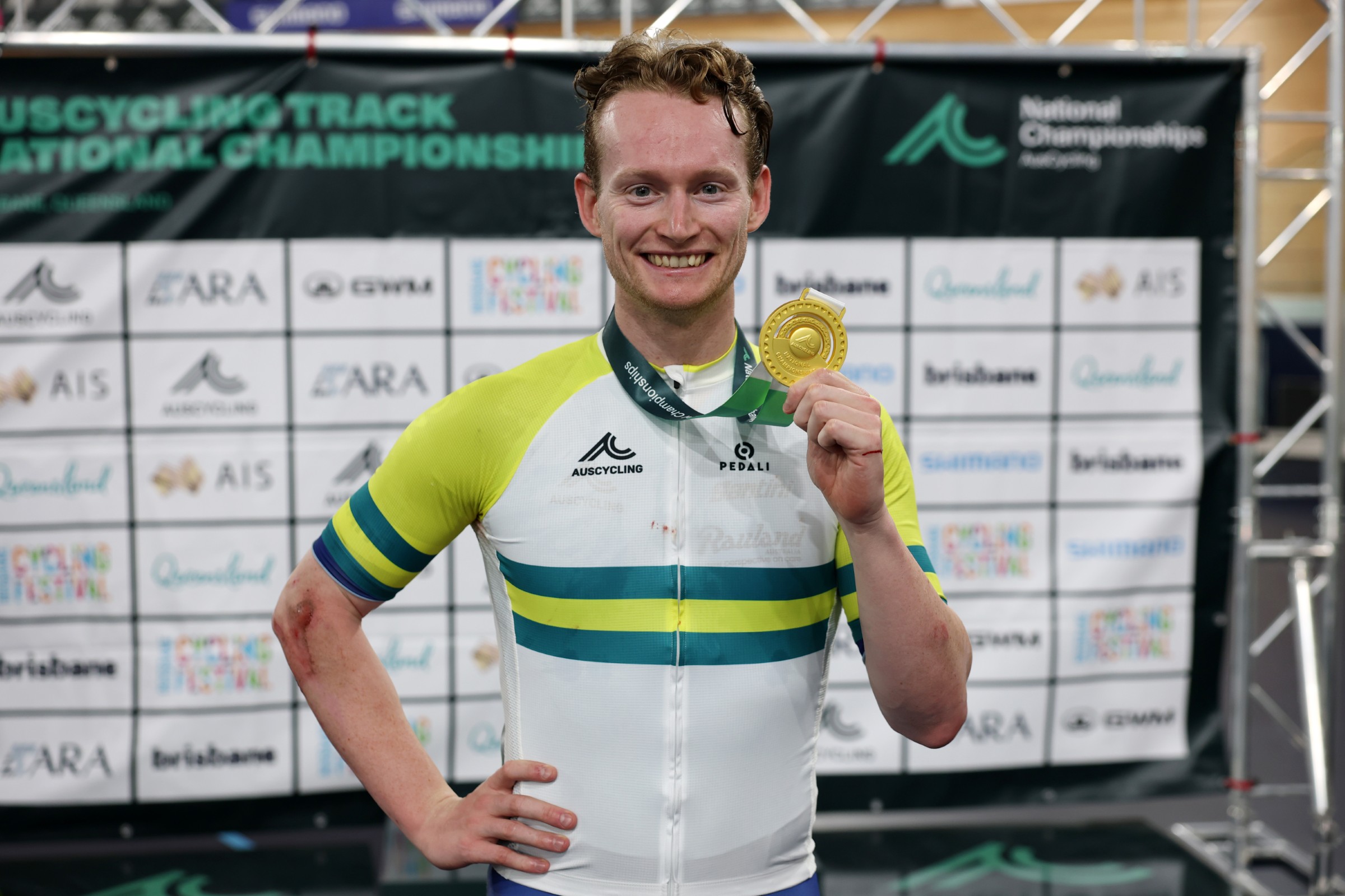 Tom Cornish (NSW) recovered from an early crash to claim a brave victory in the men’s elimination race, with ripped skin and lycra hanging from him as he crossed the line in first place.