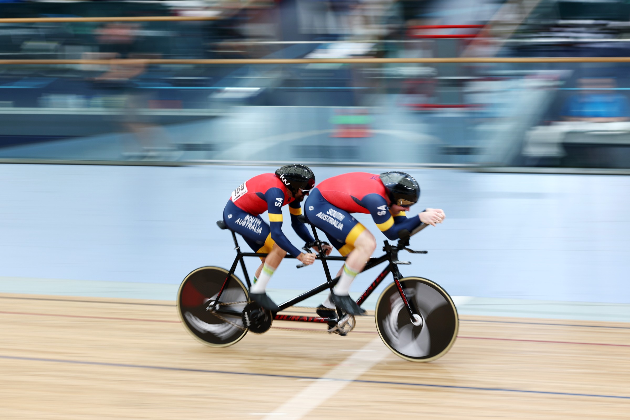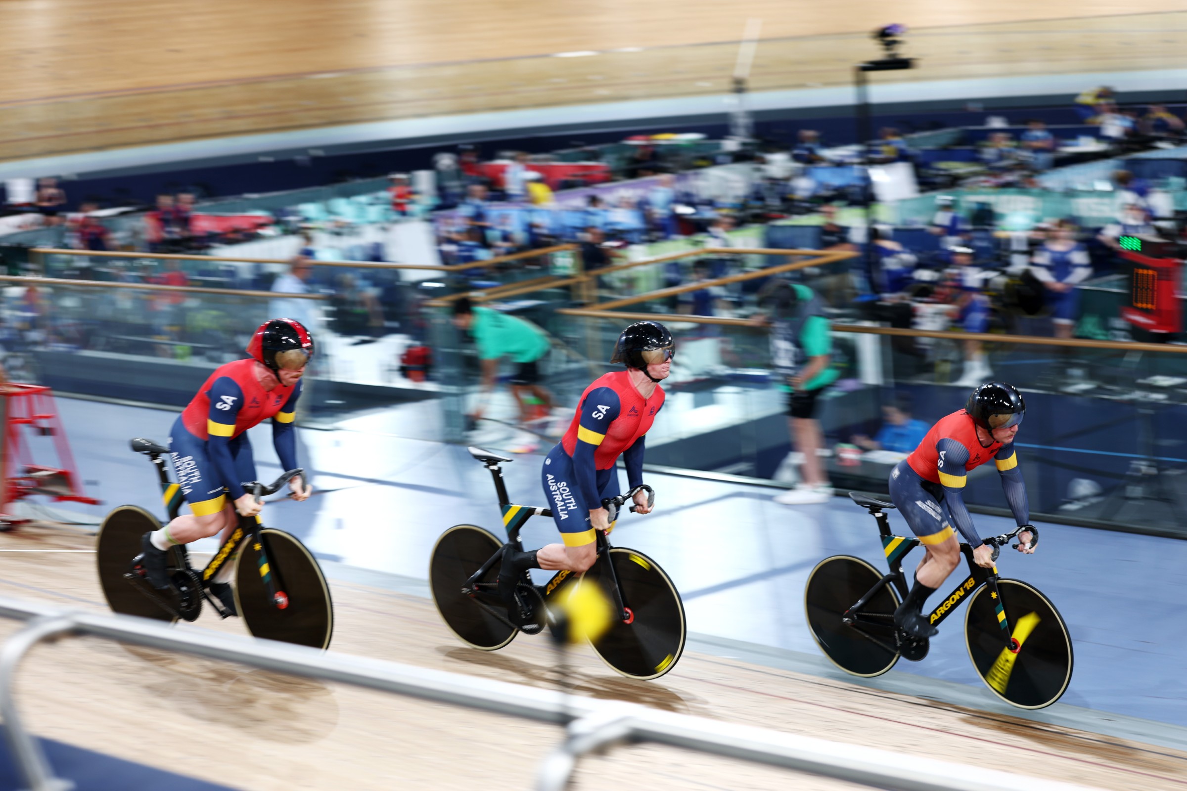 There was more drama in the men’s team sprint final when South Australia’s James Brister snapped his crank at the start line. Brister managed to stay upright as the left crankarm sheered away from his bike under load, remaining attached only to the cleat on the bottom of his shoe.